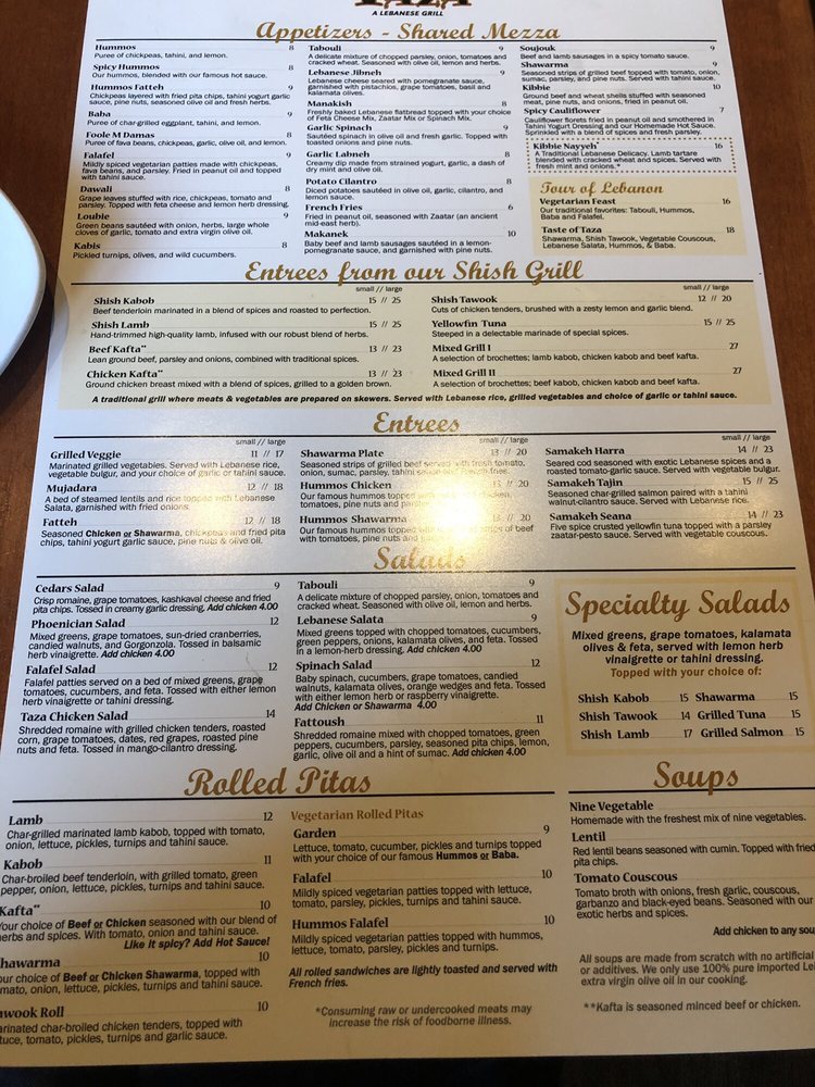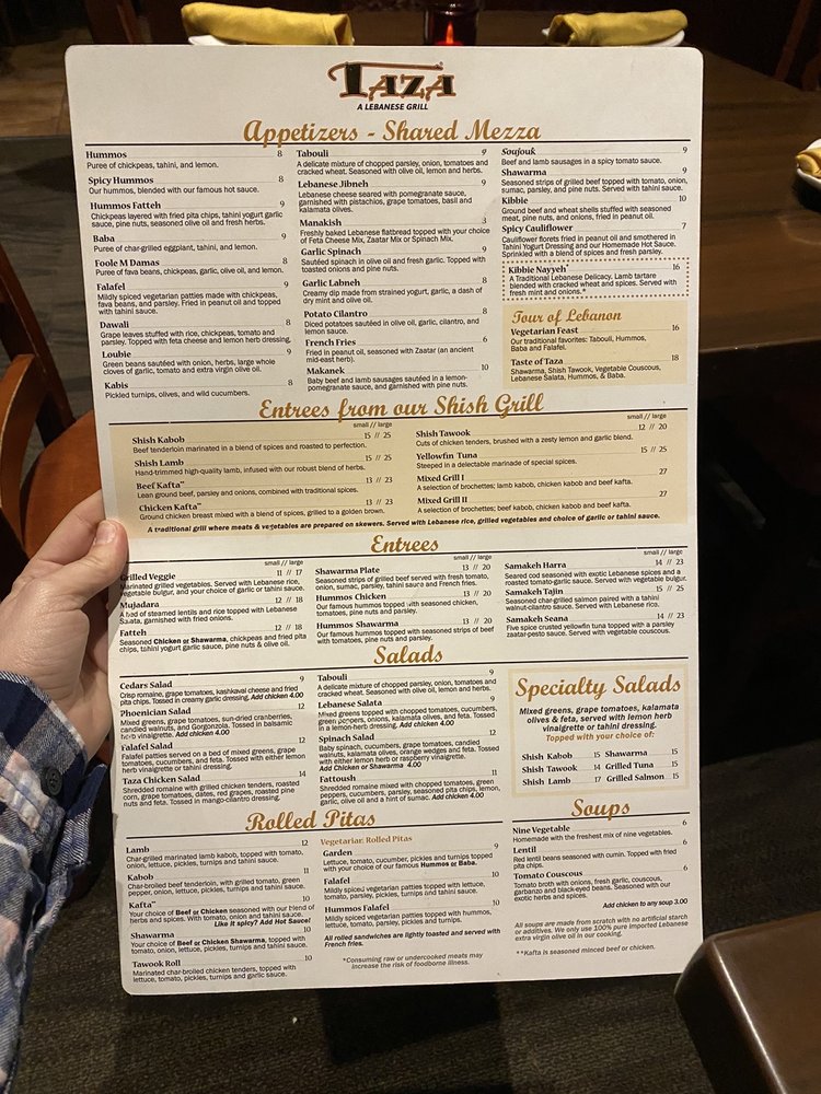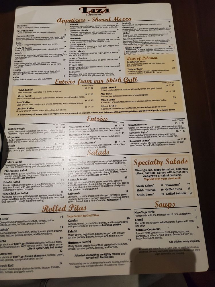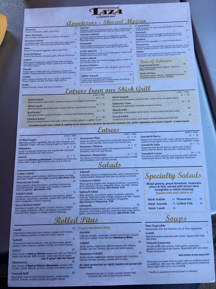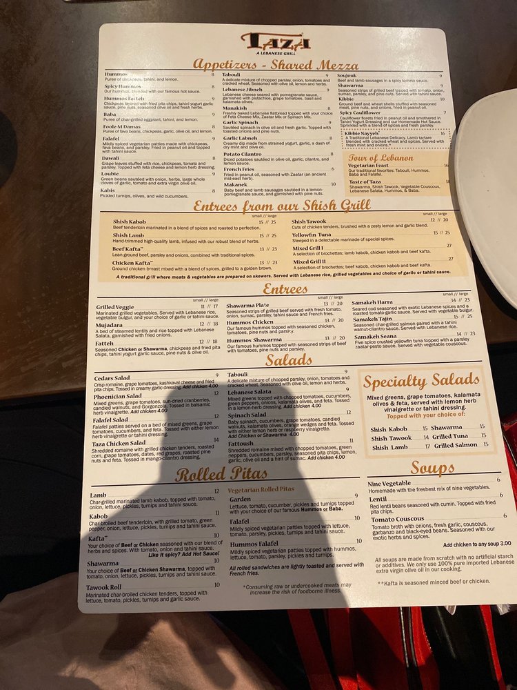 Taza - A Lebanese Grill offers a diverse menu of Middle Eastern cuisine, with a focus on fresh ingredients and traditional flavors. The restaurant provides a range of options, from appetizers like Hummos and Spicy Hummos to main courses like Shish Kabob and Mujadara. Customers have praised the attentive service, inviting ambiance, and delicious food, with standout dishes like the falafel and the Shawarma Plate receiving high praise. While some reviewers have noted slight disappointments with certain dishes, overall, Taza seems to be a popular choice for those looking for a taste of authentic Lebanese cuisine in a classy yet casual setting. With outdoor seating, waiter service, and a full bar, Taza is a great option for groups, families, or a casual lunch or dinner outing.